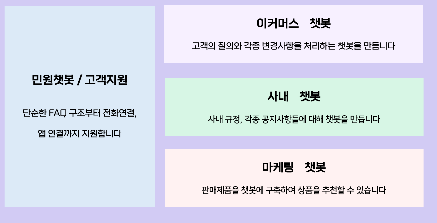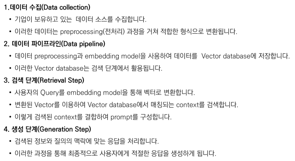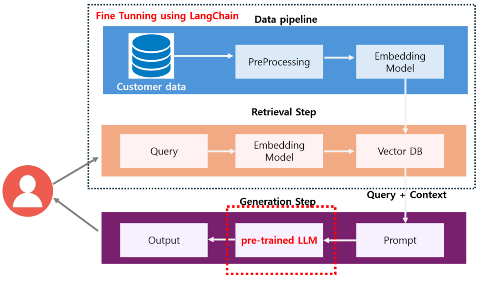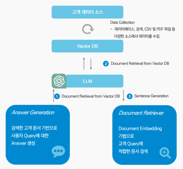 LLM, 고객맞춤형 대화형 챗봇 이커머스 ChatBOT ChatGPT의 언어처리 능력 그대로,데이터는 기업에서 보유한 데이터로, LLM, 고객 맞춤형 챗봇을 구축하여 고객에게 다양한 접점에서 빠른 속도로 정보를 제공할 수 있습니다. 고객 도메인 특화 LLM 고객 데이터로 파인 튜닝한 LLM 서비스 제공 고객 시스템과 연동 기존시스템과 연동하여주문조회, 환불 등 액션을 하는 챗봇 자연스런 대화 경험 상담사에게 질의하듯 자연스런 질의응답 경험 제공 고객을 위한 서비스를 LLM기반 챗봇으로 제공해보세요 기업내의 시스템과 연동하여 상담사에게 질의하듯이주문내역을 묻고, 환불을 신청하는 등 빠르고 접근성 높은 고객 서비스를 제공할 수 있습니다. [ RAG방식이 적용된 LLM기반 챗봇 ]